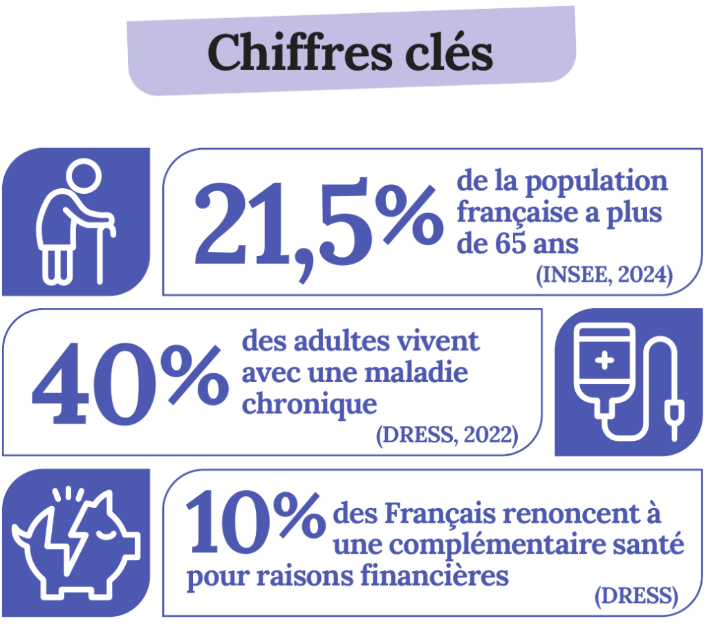 Le vieillissement de la population, la progression des maladies chroniques, l’allongement de la vie active ou encore les parcours professionnels discontinus complexifient le paysage de la protection. En France, 21,5 % de la population a plus de 65 ans et cette part atteindra un quart d’ici 2030 (INSEE). Les maladies chroniques concernent déjà près de 40 % des adultes (DREES, 2022).